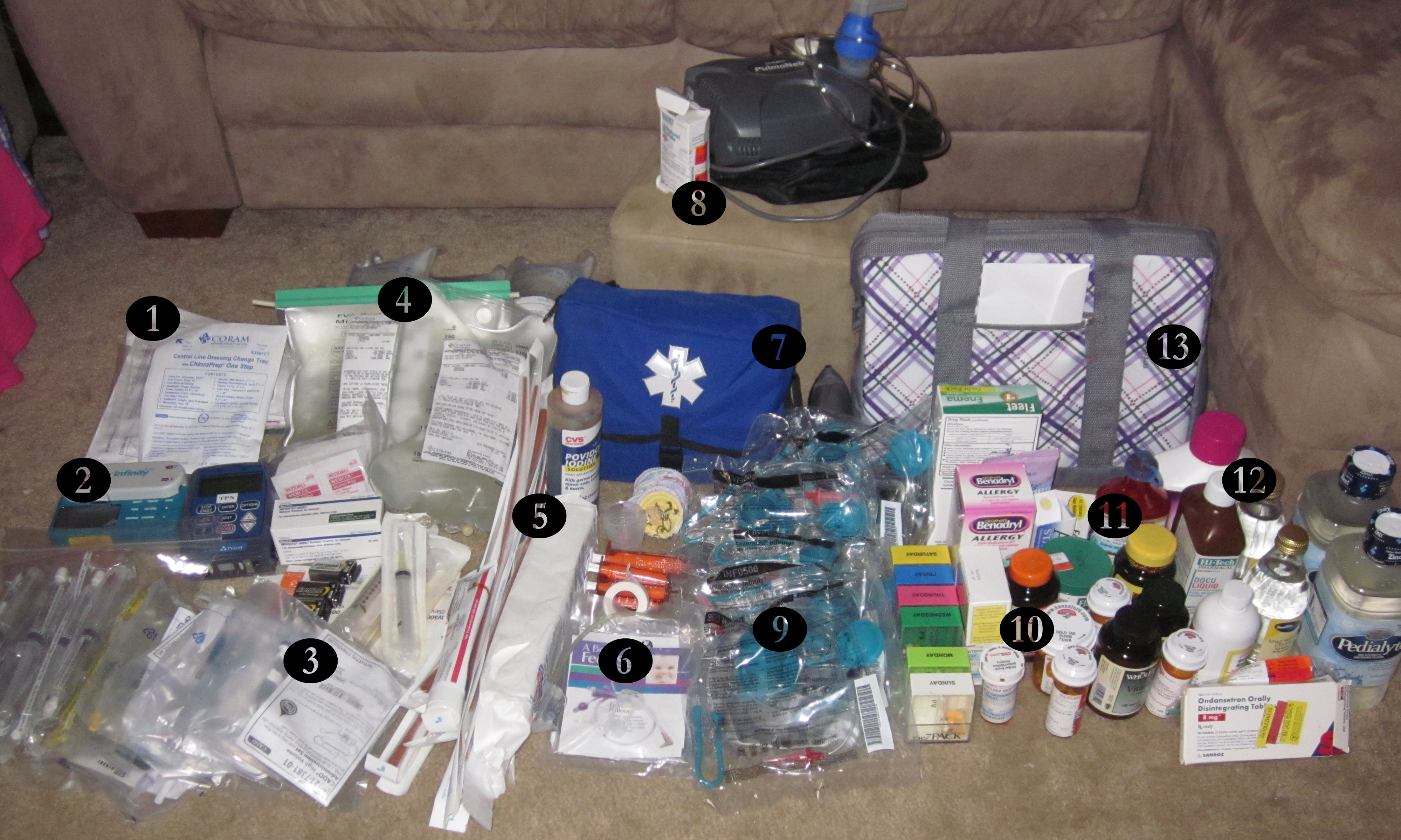 But, as I mentioned, we still had numerous other medical supplies to pack that still had to be carried with us (in addition to a day’s supply of infusions, just in case). I could go through it all that we had to organize, but I think a picture is worth 1000 words. And quite literally in this case: